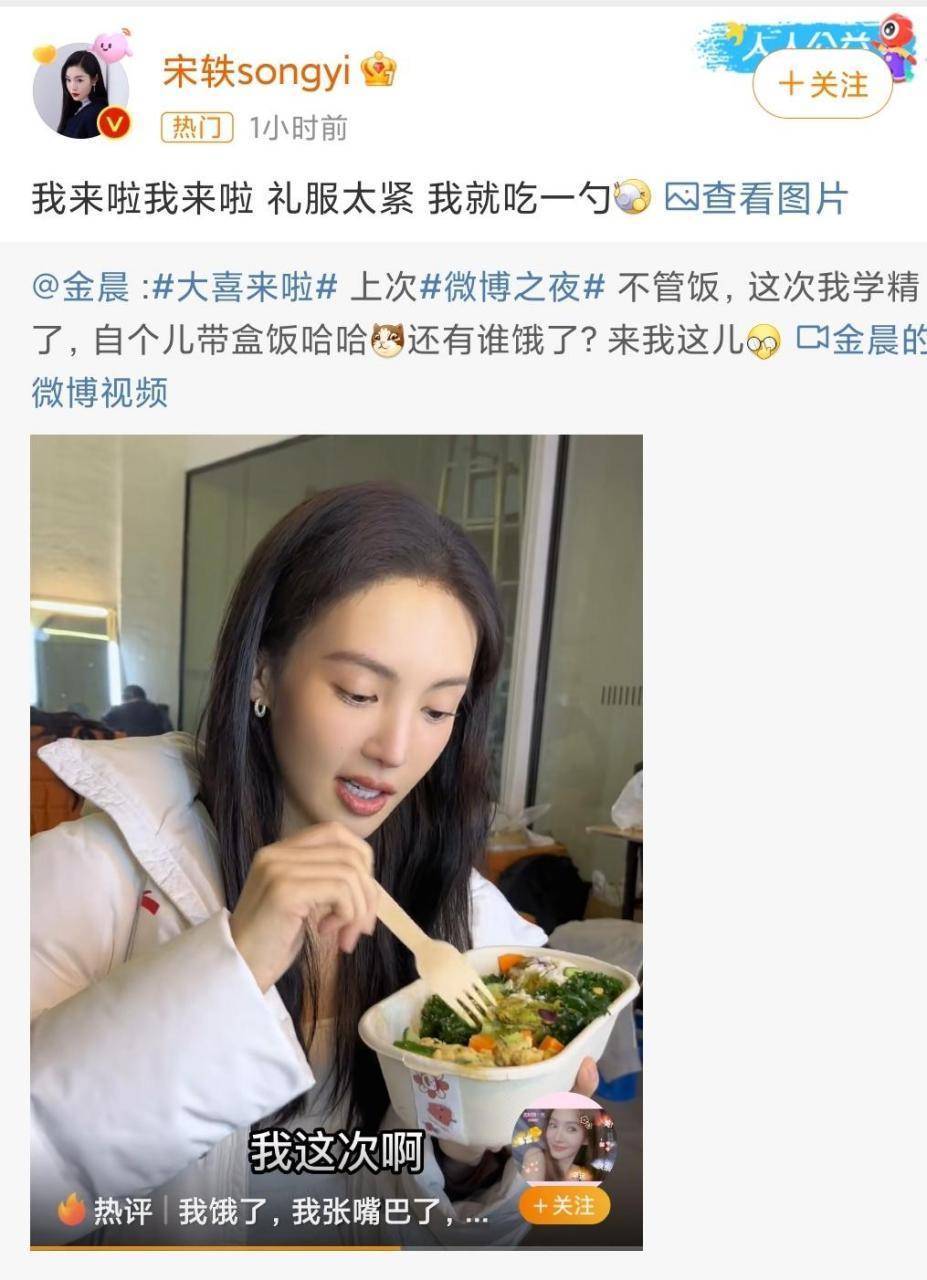 其实这已经不是金晨第一次因为“干饭”登上热搜了。早在2023年微博之夜,她就因为自带盒饭火出圈。当时有媒体拍到她提着保温桶走进会场,打开一看里面竟然是妈妈亲手做的爱心便当,荤素搭配营养均衡。被问到为啥自带食物,她耿直回答:“上次来这里没饭吃,差点饿晕,这次学聪明了!”这番话把现场记者都逗乐了,网友更是调侃:“别人参加红毯比美,金晨参加红毯比谁饭香。”更绝的是2021年她在飞机上吃泡面的视频。当时她素颜出镜,穿着宽松卫衣,捧着一大碗泡面暴风吸入,被烫得直哈气也停不下来。工作人员在旁边吐槽:“烫嘴的面打乱了我干饭的节奏!”她却头也不抬回了句:“干饭人不能输!”这段视频点赞量高达48万,评论区全是“隔着屏幕都觉得香”“姐姐吃饭太有感染力了”。